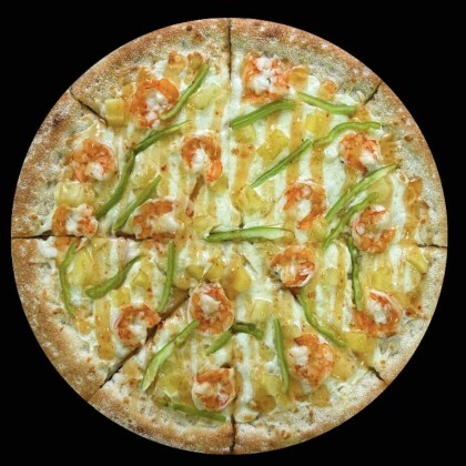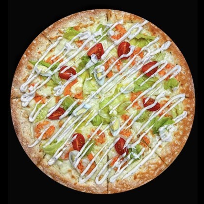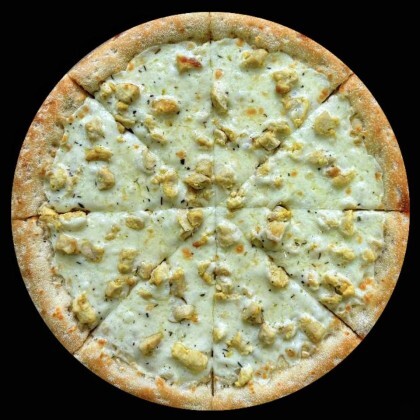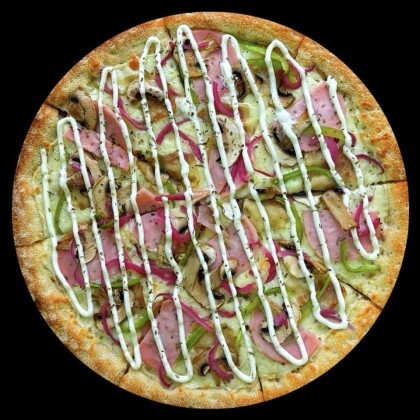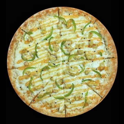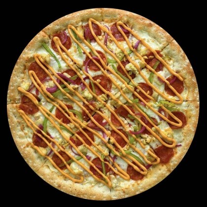 Сливочно-чесночный соус, сливочная моцарелла, пепперони, нежное филе цыплёнка, томаты, красный лук, маслины, соус барбекю.