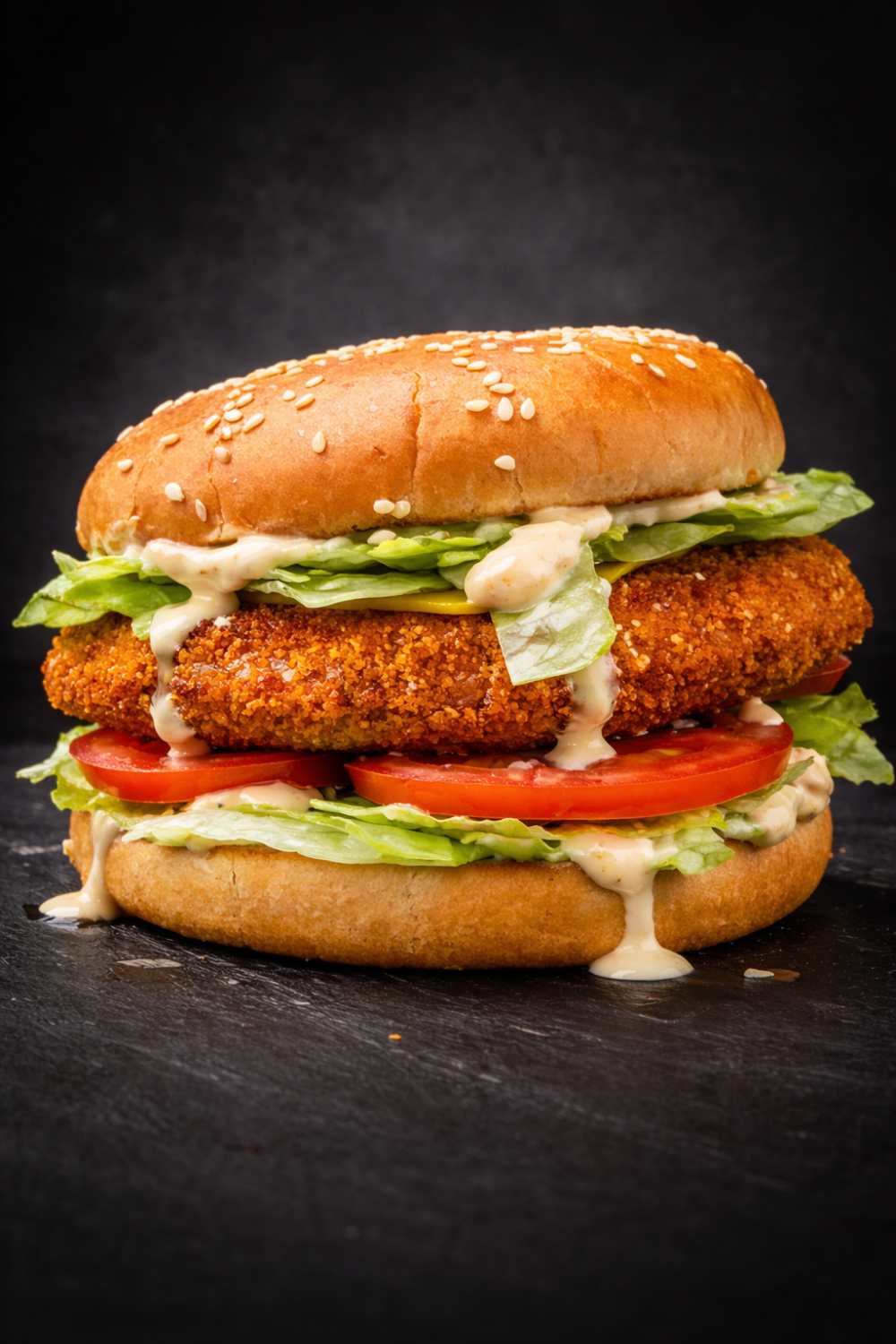 Булочка с кунжутом, хрустящая куриная котлета в панировке, сыр, салат айсберг,красный лук, томат, солёный огурец и фирменный горчичный соус.