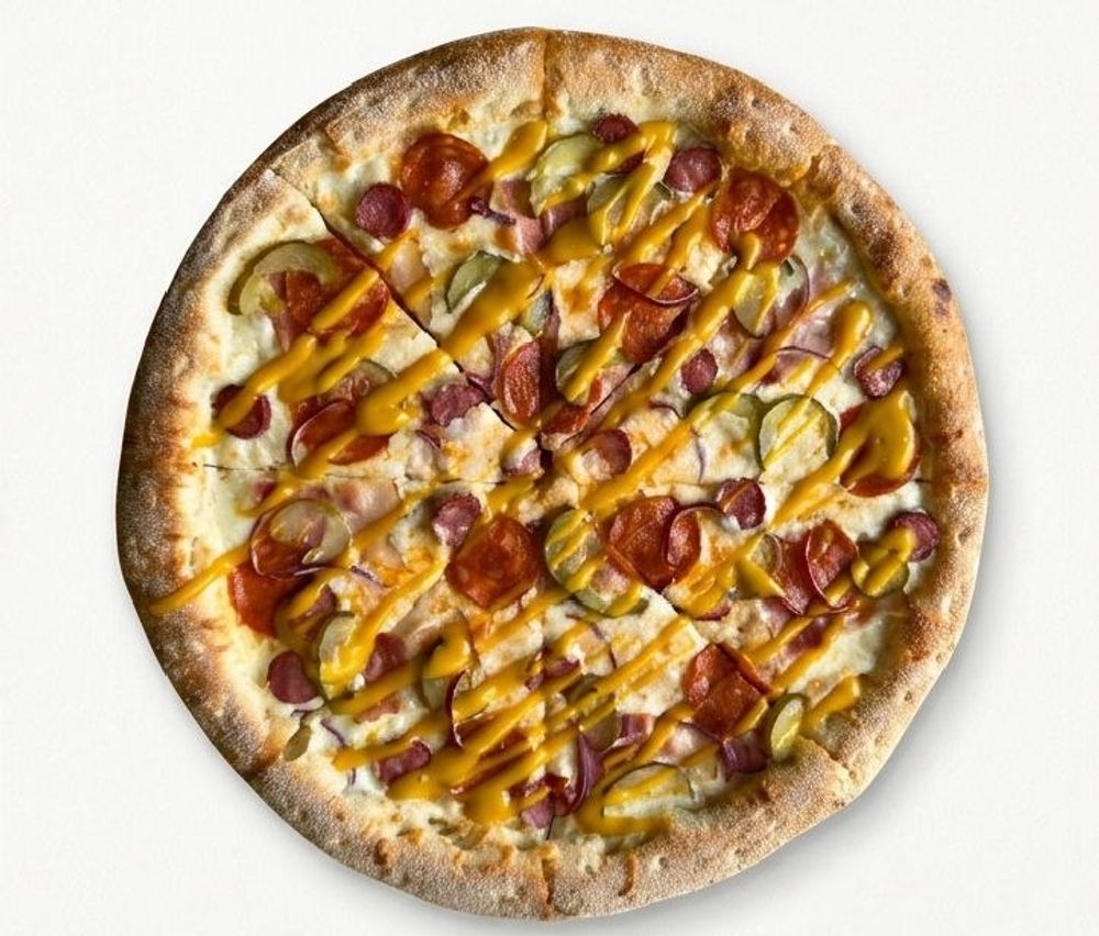 Томатный соус, сливочная моцарелла, "Баварские колбаски", колбаски Чоризо, бекон, солёные огурцы, свежий красный лук, соус Медово-Горчичный.